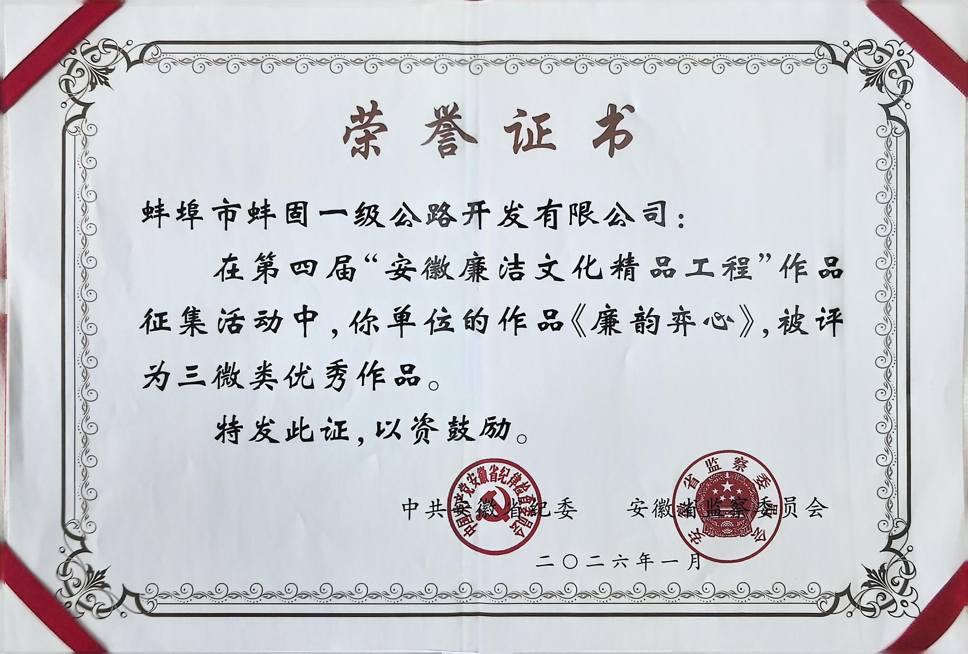 近日,中共安徽省纪委、安徽省监察委员会正式公布第四届安徽廉洁文化精品工程作品征集评选结果,由伟德国际1949报送、交控集团选送、蚌固路公司创作的廉洁文化作品《廉韵弈心》,成功获评三微类优秀作品。该奖项是全省廉洁文化领域最高层级官方奖项,充分彰显了集团廉洁文化建设的突出成效。