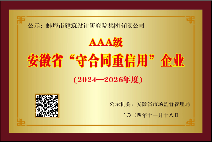 2024年11月18日,蚌埠市建筑设计研究院集团有限公司荣获安徽省AAA级“守合同重信用”企业称号。
