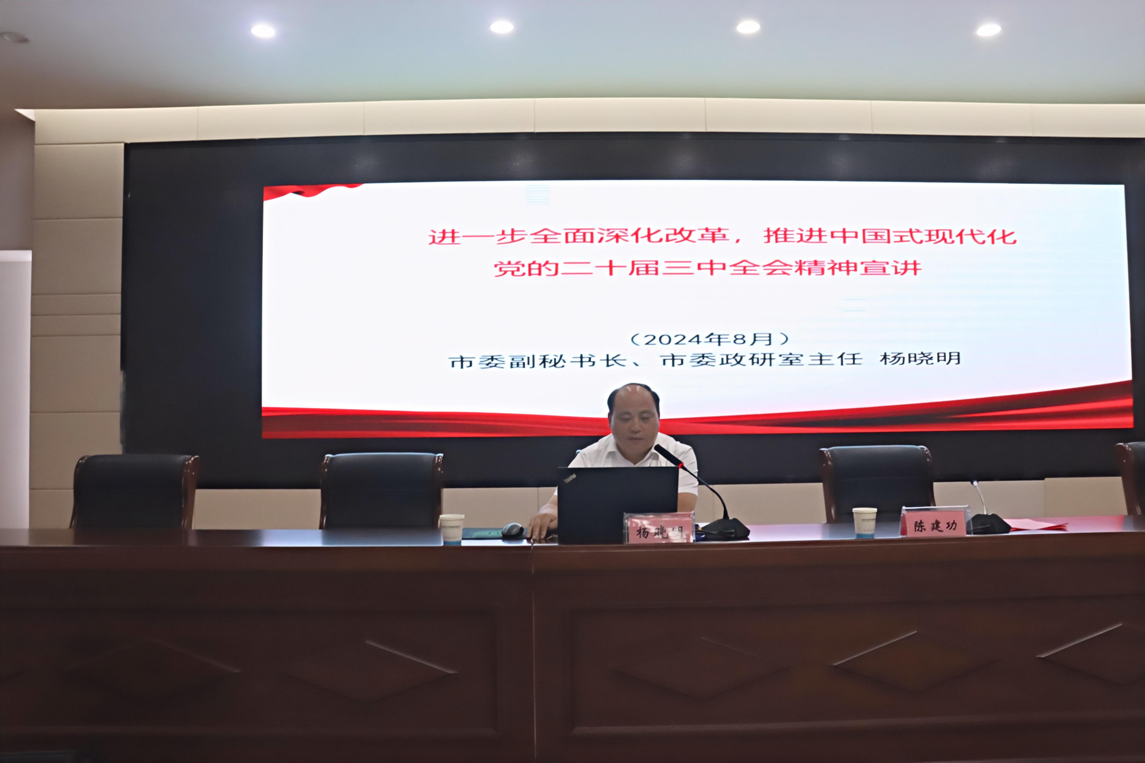 杨晓明以《进一步全面深化改革推进中国式现代化》为主题,紧紧围绕习近平总书记在党的二十届三中全会上的重要讲话和全会《决定》,从深刻认识进一步全面深化改革的重大意义、全面把握党的二十届三中全会的改革重点、以钉钉子精神抓好改革落实和从《决定》看国资国企高质量发展方向四个方面,对全会精神进行了系统阐述和全面讲解,并结合蚌埠市工作实际,进一步解读了全面深化改革的主旨要义。