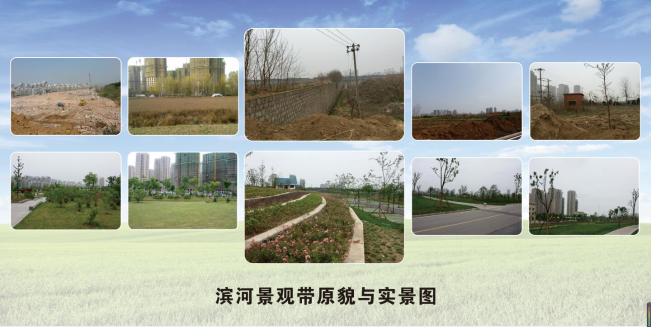 该项目位于蚌埠市淮上区,南起淮北大堤堤顶,北至滨河路边,为狭长型地块,东西长约4.3公里,绿地景观面积49万平方米。项目建设之前,地块上有附近村民自种的庄稼、小菜园,也有野生的杂草灌木,景色荒芜萧条。2013年,市委市政府要求对淮河北岸进行环境整治,为人民群众提供一个环境优美,悠闲舒适的休闲场所,由城开公司负责项目建设。该项目采用工程总承包中设计施工一体化(DB)模式招标,由中标人负责项目的设计施工。2014年11月完成项目的建设任务,为广大市民营造了一个以人为本的现代滨河休闲公园、综合性景观走廊,绿化植物有银杏、香樟、桂花等,植物层次丰富,物种多样,四季变化繁复,覆盖率在90%以上,展现了林成荫、树成群、草成片、花成丛的优美景观。